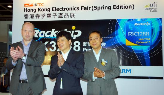 2014年4月13—16日,亞洲香港春季電子展在香港灣仔議展覽中心舉行,多家全球著名電子廠商參與了這一盛會。作為國內領先的ARM芯片方案廠商,瑞芯微更是攜眾多技術方案亮相。在15日當天上午,瑞芯微現場召開發布會,聯合ARM正式推出旗下RK3288處理器。瑞芯微全球副總裁陳鋒先生、ARM全球副總裁Dennis先生、ARM多媒體市場總監Sherry女士以及ARM中國區市場總監Andy先生出席了發布會并作精彩演講。