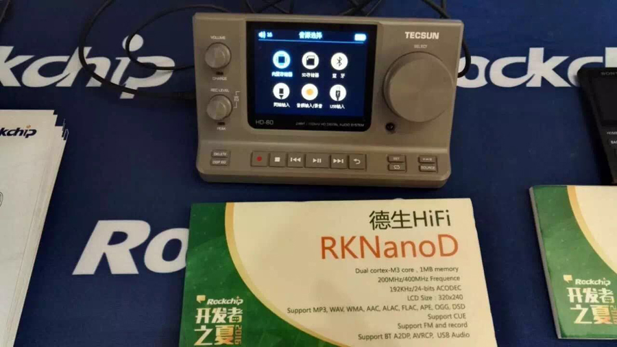 現(xiàn)場展示了多款搭載RKNanoD的音響設(shè)備,具備七大特點(diǎn):好聲音(>100dB SNR)、真HiFi(24bit 192Khz)、低功耗(8mA MP3播放)、高性能雙核M3、大容量1MB SRAM、無線連接、FreeRTOS。