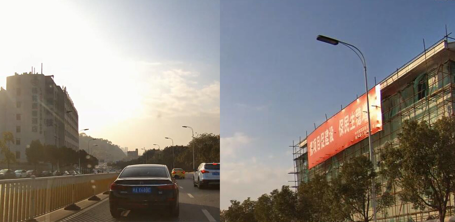 RV1108在逆光場景表現穩定,強光下,交通標識牌,建筑群、周邊街景等依然清晰。體現了RV1108圖像處理在“寬動態”方面的優勢。
