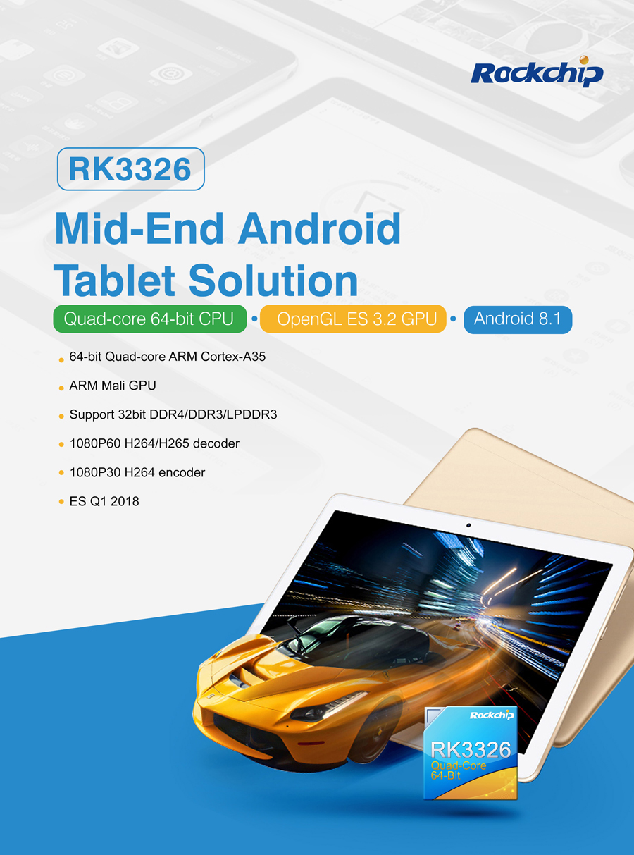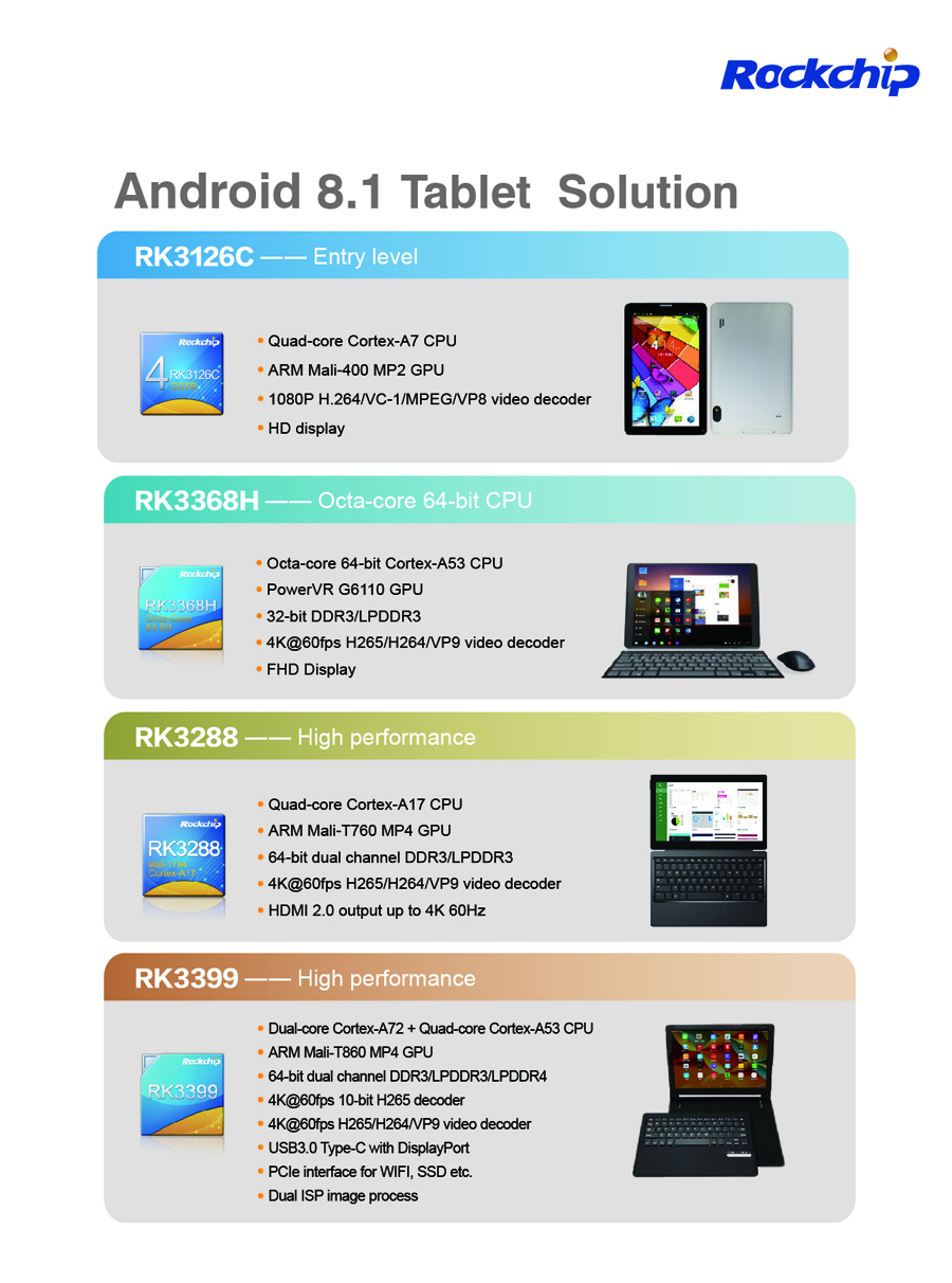 CES 2018消費電子展,Rockchip展出各系列平板方案,從入門級RK3126C,全新中端方案RK3326到高端系列RK3399,已全面支持Android8.1操作系統,將更好滿足市場的多樣需求。