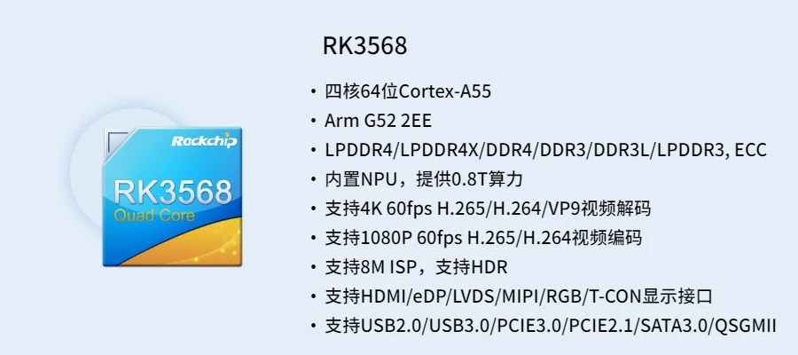 RK3568芯片是瑞芯微全新推出的新一代AIoT計(jì)算平臺(tái),除具有高性能CPU和GPU外,還搭載第三代AI處理器,有效滿足智慧視覺(jué)、工控、物聯(lián)網(wǎng)網(wǎng)關(guān)應(yīng)用的性能需求。其具備五大技術(shù)特性: