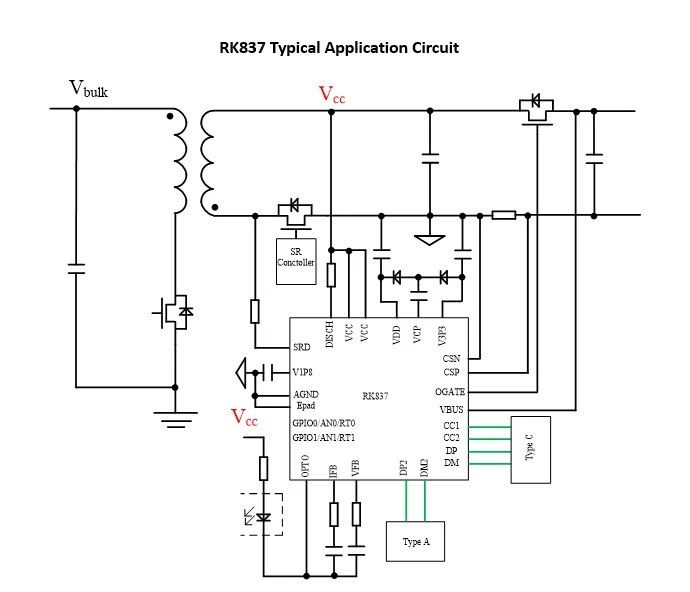 < 圖為RK837應用電路,支持1A1C輸出,采用QFN4*4-24封裝>