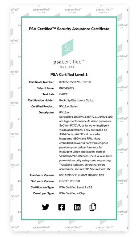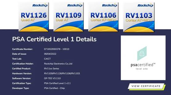 瑞芯微RV11xx系列芯片通過Arm PSA Certified安全認證