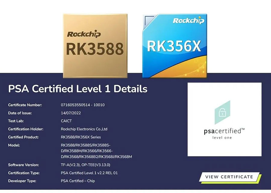 近日,瑞芯微RK3588及RK356X系列芯片(包含RK3588/RK3588S/RK3588S-D/RK3588M/RK3566/RK3566-D/RK3568/RK3568B2/RK3568J/RK3568M)正式通過PSA Certified Level 1安全認證。