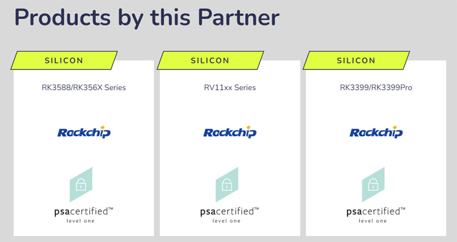 目前,瑞芯微芯片已在千行百業中廣泛應用,我們持續創新,為終端伙伴提供更強大技術支持的同時,也在積極推動及保障物聯網生態安全。瑞芯微已有多款芯片獲得PSA Certified認證,包括視覺芯片RV11XX系列、高性能旗艦芯片RK3399Pro及RK3399。其中,RK3399Pro和RK3399同時獲得了Arm發起針對設備的硬件和固件兼容性的Arm SystemReadyTM IR(IoT Ready)認證。