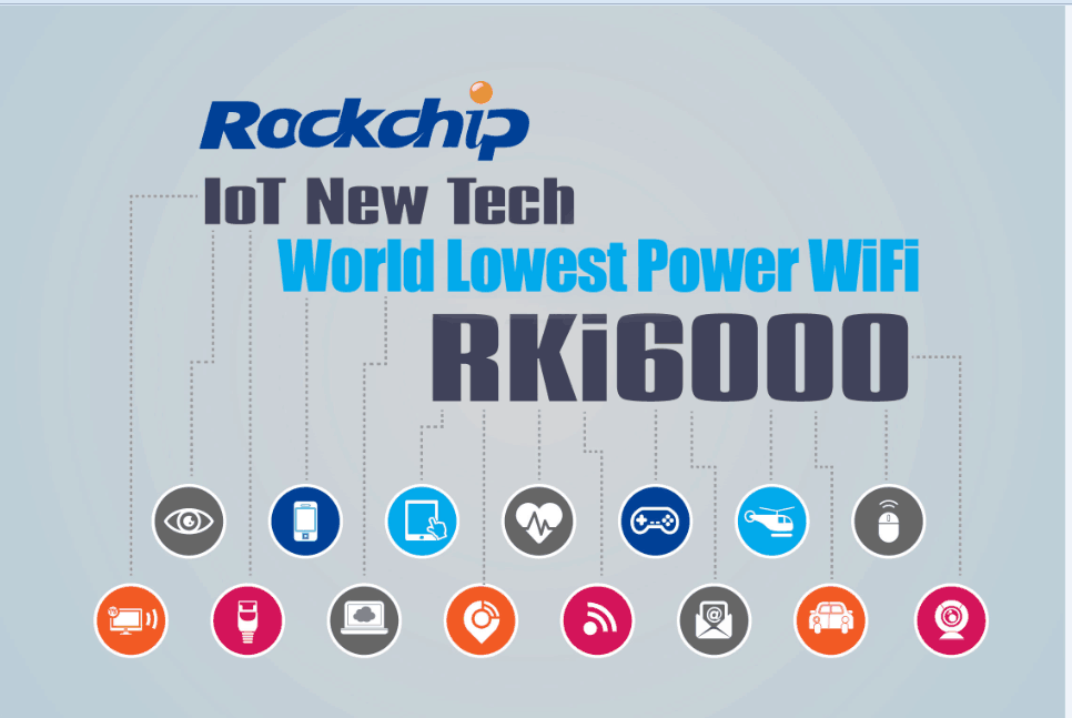 June 2, 2015, COMPUTEX Taipei, Rockchip announced that it launches the world lowest power WiFi technology RKi6000 jointly developed with a 3rd party. This technology makes the power consumption of WiFi same as that of BT4.0 LE (Low Energy). The Receiving power consumption is around 20mA during use, which is 85% lower compared with state-of-the-art WiFi devices for IoT. This benchmarking power consumption level should renew the standard for WiFi power consumption in IoT smart hardware globally.