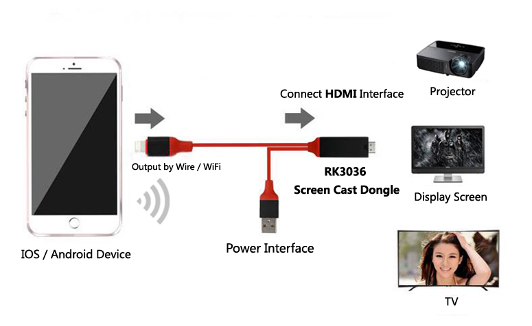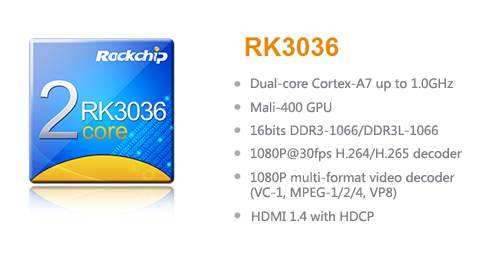 Rockchip RK3036 chip adopts Dual-core Cortex-A7 architecture, up to 1.0GHz; support 1080P H.265, H.264, VC-1, MPEG and VP8 Video Decoder; compatible with streaming media formats of different protocols; support different screen cast interaction protocols such as DLNA, Miracast, WiDi and other interoperability protocols.